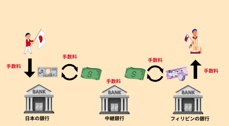 例えば日本からフィリピンに送金しようとすると、下記のようなフローを行わないといけないんです。